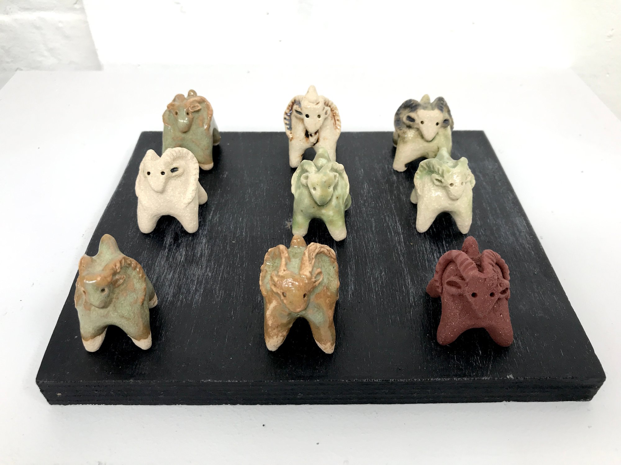 White and red stoneware goats. A selection of individually hand built goats, some glazed with a green/brown glaze, others decorated with oxides and unglazed. approximately 2cm in height.